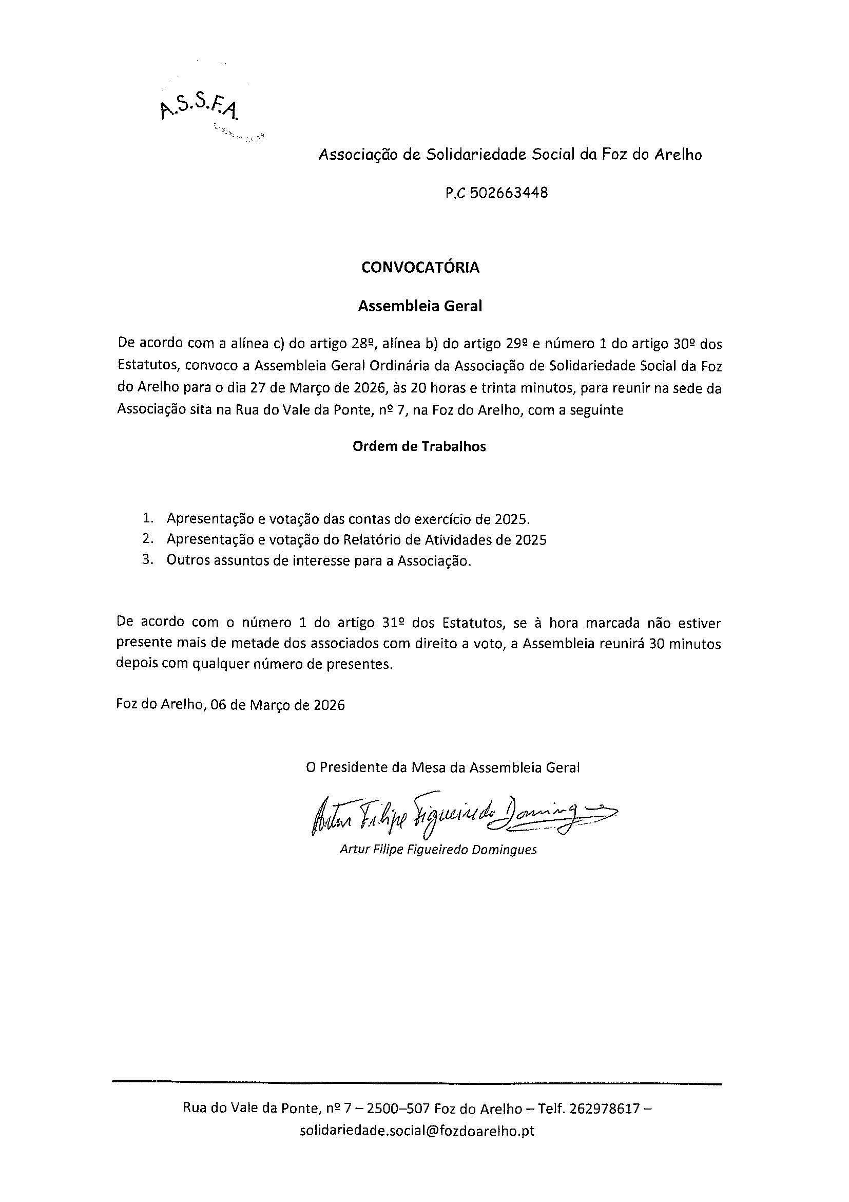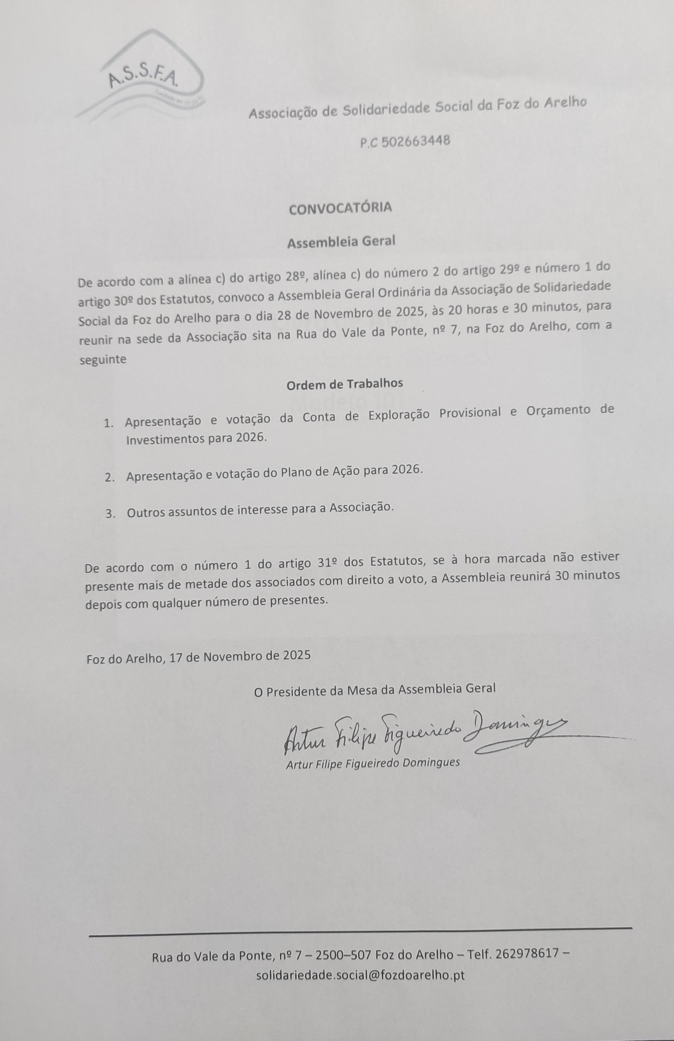 Rua Vale Ponte 7, 2500-507 Foz Arelho, Portugal (+351) 262 978 617 (+351) 262 978 275 solidariedade.social@fozdoarelho.pt